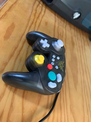 Mando de control con diseño inspirado en The Legend of Zelda. - Compatible con Nintendo Switch y GameCube. - Conexión por cable USB. - Diseño transparente oscuro. - Incluye joystick, cruceta y botones de acción.