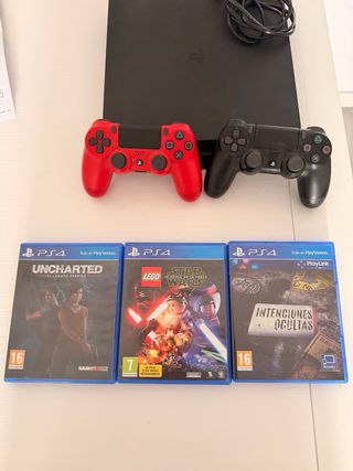 Solo envíos. Consola Playstation 4 500 gb en color negro, junto con dos mandos (uno negro y otro rojo) y dos videojuegos. - Incluye consola Playstation 4. - Dos mandos Dualshock 4. - Videojuego Lego Star Wars: The Force Awakens. - Videojuego Intenciones Ocultas. - Videojuego: Uncharted El legado perdido. - No incluye HDMI. La consola está súper bien cuidada, se vende por cambio a PS5 pero está play tiene mucho entretenimiento que dar todavía.