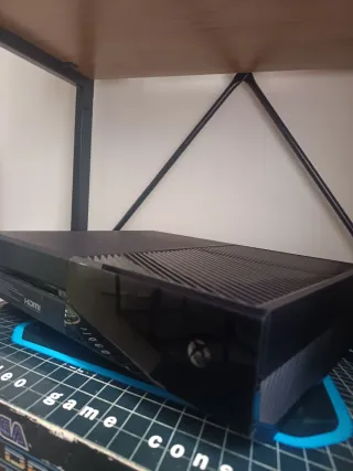 Consola Xbox 360 en color negro. - Diseño elegante y compacto. - Botón de encendido circular con detalles azules.