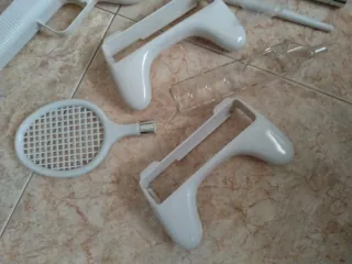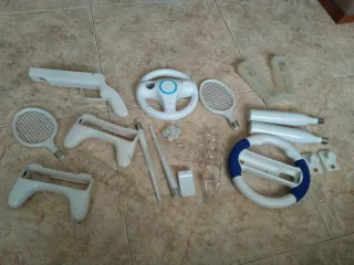 Lote de accesorios para Nintendo Wii. - Funda tipo pistola blanca. - Volante blanco con detalles azules. - Dos raquetas de tenis blancas. - Dos soportes para mandos Wii. - Dos palos blancos. - Dos soportes transparentes. Y mucho mas