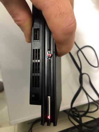 Consola PlayStation 2 Slim en color negro, con un mando transparente en color rojo. - Incluye mando. - Modelo Slim.