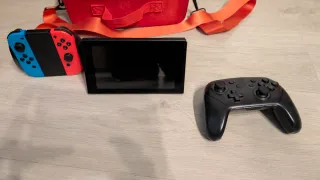 Consola Nintendo Switch con sus accesorios originales. Incluye: - Maleta de de transporte de Pokémon - Funda de transporte de Super Mario - Mando tipo pro original de Nintendo