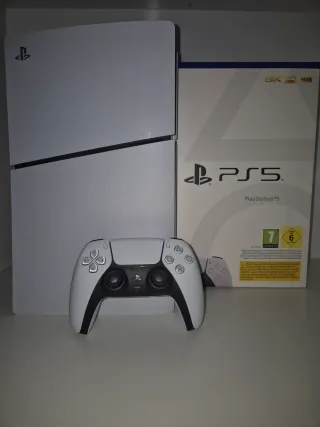 Consola PlayStation 5 Slim con lector de discos y almacenamiento de 1TB con su respectiva caja y embalaje original. - Diseño moderno en blanco y negro. - Incluye mando DualSense. -Cables de conexión y alimentación. -Manual de usuario. Muy poco uso y está como nueva. Venta SOLO en persona. No acepto mareantes.