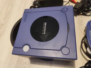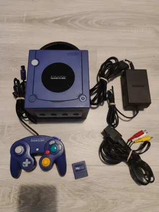 Consola Nintendo GameCube en color azul/morado, lista para jugar. Incluye todos los cables y un mando. - Consola Nintendo GameCube - Mando original - Adaptador de corriente - Cable AV con conexiones RCA (amarillo, rojo, blanco) - Tarjeta de memoria BigBen de 256 MB