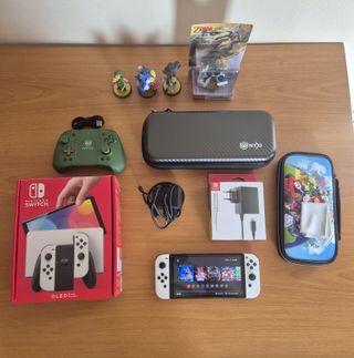 ¡Hola! Vendo mi Nintendo Switch OLED impecable. Está muy bien cuidada y la pantalla no tiene ni un solo rasguño. La vendo para financiar la compra de un portátil para mi TFG, por lo que busco una venta seria en mano. El pack incluye: Consola Nintendo Switch OLED: Con su caja original, Dock para la TV y cargador oficial. 2 Joycons adicionales: (Total 4 mandos) ideales para jugar en familia o con amigos. Amiibo Link Major - Consola Nintendo Switch OLED. - Mando NYXI en color verde. - Base de carga para Joy-Cons. - Funda de transporte con diseño. - Cargador oficial Nintendo. - Cable HDMI. - 4 figuras Amiibo de The Legend of Zelda.