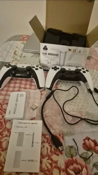 Pack de consola retro con dos mandos inalámbricos. - Incluye dos mandos de color blanco y negro. - Conexión inalámbrica 2.4G. - Incluye cable de carga USB-C. - Manual de instrucciones.