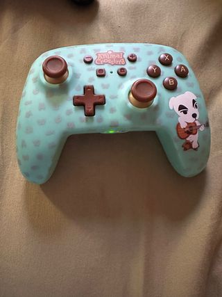 Mando inalámbrico con diseño de Animal Crossing. -Funciona con pilas y dura mucho la batería. -Está en perfecto estado y funcionan perfectamente todos los botones. - Color verde menta con detalles de personajes. - Incluye joysticks y botones en tono marrón.