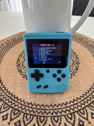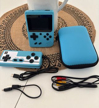 Lote Nueva Consola portátil de estilo retro con funda protectora y cables. - 400 in 1 games. - Incluye mando adicional. - Cable de carga USB. - Cable AV para conexión a TV.
