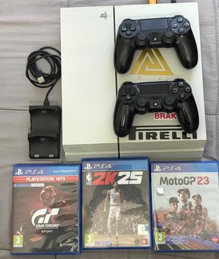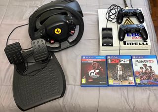 Pack de gaming:PS4 500 gb que incluye un volante con pedalera,dos mandos con base de carga. 4 juegos - Volante Ferrari thrustmaster T80 - Base de pedales. - Dos mandos DualShock 4. - Juegos incluidos: Gran Turismo Sport, NBA 2K25, MotoGP 23 y Assassins Creed mirage