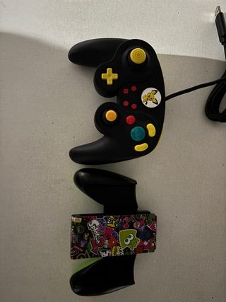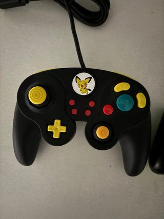 Mando de GameCube personalizado con temática de Pikachu y Splatoon. Diseño único y llamativo. - Color principal negro. - Detalles en amarillo, rojo y azul. - Pegatina de Pikachu en el centro. - Adhesivo de Splatoon en la parte inferior.