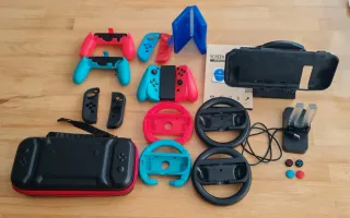 Mando ergonómico compatible con consola y soporte, funda semirrígida con compartimentos, funda protectora consola, dos protectores de pantalla, caja de juegos, soporte de carga, soporte consola, mandos originales Nintendo Mario kart y diversos accesorios de mandos