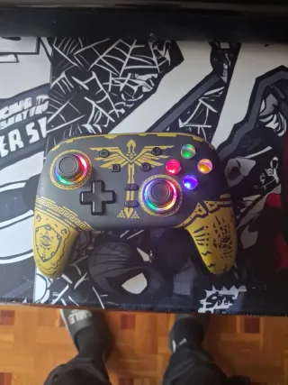 Mando Pro Controller para Nintendo Switch con un diseño inspirado en The Legend of Zelda. Presenta detalles dorados y luces LED. - Diseño temático de Zelda. - Luces LED en los joysticks y botones.