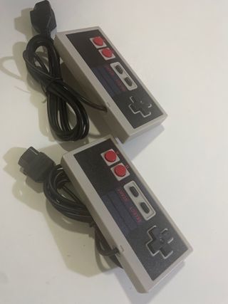 Pack de dos mandos para la consola Nintendo NES. - Diseño retro gris y negro. - Botones de acción rojos. - Cruceta direccional. - Botones Select y Start.