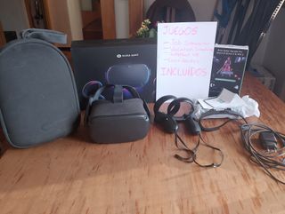 Oculus Quest 1 en muy buen estado. Incluye caja original, funda original, cargador y mandos originales. También incluye adaptador para usar con gafas y palos para Beat Saber. La pantalla funciona perfectamente. Tiene un pequeño punto rojo apenas visible, que solo se aprecia en fondos blancos y no afecta al juego. Incluye juegos: Job Simulator, Vacation Simulator, Superhot VR y Last Recipe (si se mantienen en la cuenta). Funciona todo perfectamente. Entrega por envio