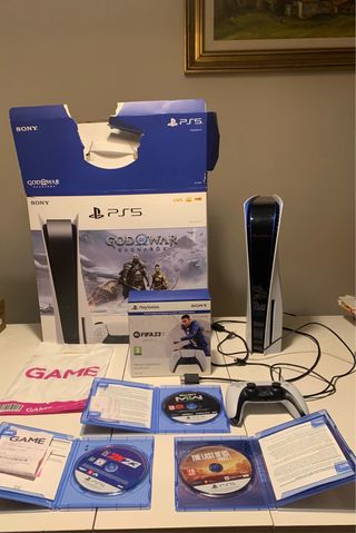 Consola PlayStation 5 en color blanco, sin usar y con ticket de compra. - Incluye 2 mandos DualSense. - Incluye 4 juegos: God of War Ragnarök, FIFA 23, golf 2K23, Call of Duty: Modern Warfare II y The Last of Us Part I.