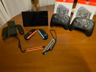 Consola Nintendo Switch con accesorios y juegos. - Incluye 2 mandos Joy-Con (uno azul y otro naranja). - Incluye 5 juegos, entre ellos FIFA '26. - Incluye funda para la consola. - Incluye base de carga para Joy-Con.