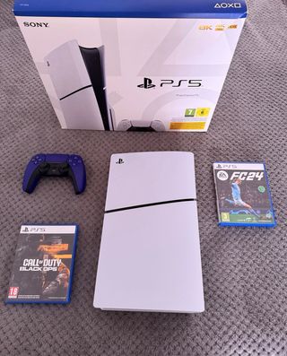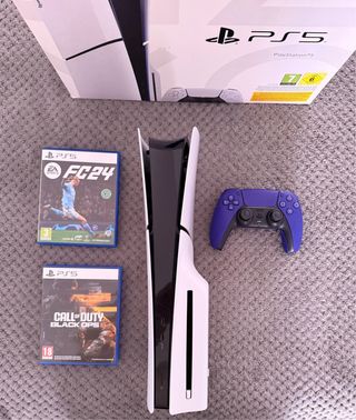Consola PlayStation 5 Slim en color blanco, mando Dualsense en color morado y dos juegos físicos, prácticamente nuevo. - Almacenamiento 1Tb - Incluye sus cables originales - Incluye el juego FC 24.