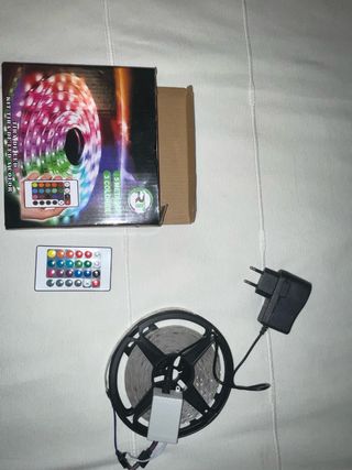 Kit de tira de luces LED RGB para crear ambientes coloridos. Incluye mando a distancia para controlar los colores y efectos. - Tira de 5 metros. - Múltiples colores y modos. - Incluye adaptador de corriente.