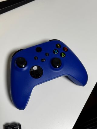 Mando de Xbox en color azul. - Diseño ergonómico. - Botones frontales con letras de colores (A, B, X, Y). - Cruceta direccional. - Sticks analógicos. - Botones superiores y traseros. -el jostyck derecho se va un poco hacia arriba