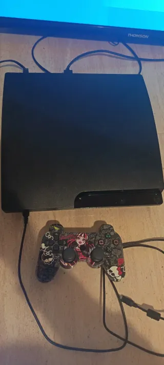 Consola PlayStation 3 en color negro. Incluye mando personalizado. El mando se le acaba la bateria rapido pero funciona perfectamente - Mando con diseño de Monster High y calaveras. - Cables de conexión incluidos.