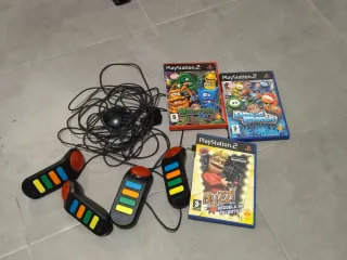 Pack de cuatro mandos Buzz para PlayStation 2: - Conexión por cable USB Juegos: - BUZZ Monsters - BUZZ Robot Mania - BUZZ Escuela de Talentos