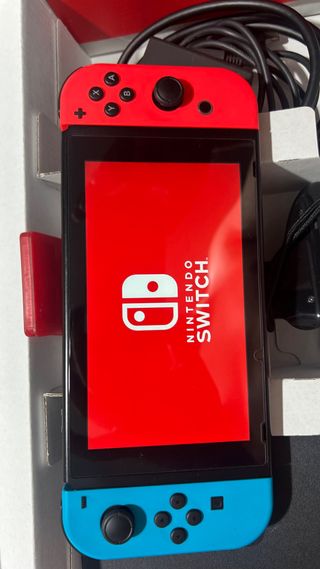 Consola Nintendo Switch pirateable en color azul, lista para jugar. Incluye: - Mandos Joycon en verde y rosa NO originales. - Mandos Joycon nuevos sin estrenar en su caja. - Mando Pro inalámbrico. - Base de carga para la consola - Cable de carga
