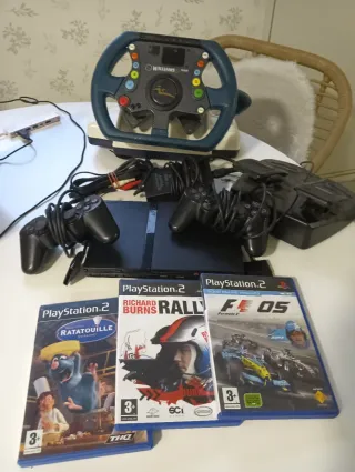 Consola PlayStation 2 negra, lista para horas de diversión. - Incluye la consola. - Dos mandos. - 4 Tarjetas de memoria ,3 de 8 mb y 1 de 32 mb - Juegos: Ratatouille, The Lord of the Rings: The Two Towers, Shrek 2, Tekken 5, Virtua Tennis 2, el Padrino y regalo juegos lleva también 4 micrófons sing estar y 4 mandos del juego de Buzz y juegos Buzz y juegos de sing estar.