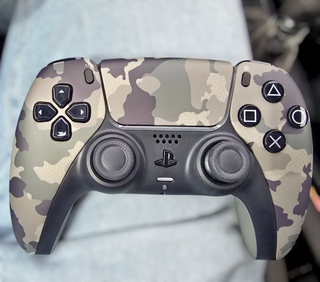 Mando de consola con diseño de camuflaje militar. - Diseño de camuflaje en tonos verdes y marrones. - Botones de control con símbolos clásicos.