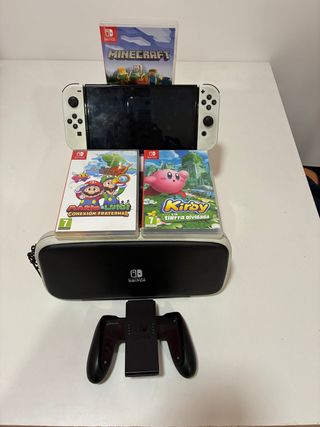 Consola Nintendo Switch OLED en blanco y negro, junto con varios juegos y accesorios. Con signos de uso que no oculto en las fotos. - Juego Minecraft. - Juego Mario & Luigi: Conexión Fraternal. - Juego Kirby y la Tierra Olvidada. - Funda de transporte. - Mandos Joy-Con con agarre. - Tarjeta de memoria de 32 Gb - Mando adicionaL
