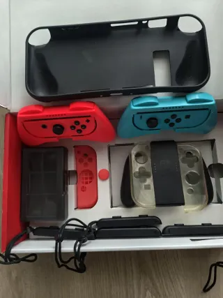 Set de mandos y accesorios para Nintendo Switch. - Mandos Joy-Con en color rojo y azul. - Funda protectora negra. - Soporte para mandos. - Correa para mandos. Etc