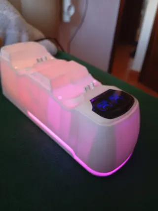 Base de carga para dos mandos de PS5 con iluminación LED azul. - Diseño elegante en color blanco. - Carga simultánea de dos mandos. - Indicadores LED de estado de carga.