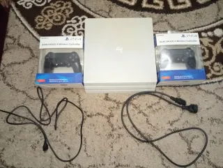 Consola PlayStation 4 Pro de 1TB en color blanco, junto con dos mandos inalámbricos Dualshock 4. - Incluye dos mandos Dualshock 4 de segunda Gen.(Están usados pero en perfecto estado, incluso van en su caja). - Capacidad de almacenamiento de 1TB.