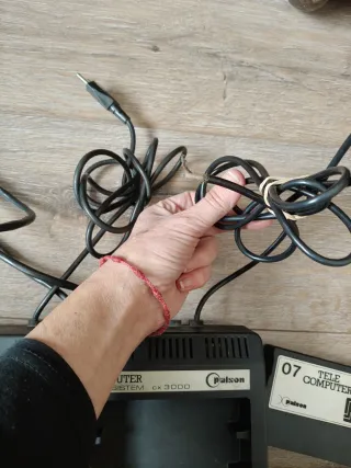 Consola Tele Computer Palson CX3000 en color negro. Incluye dos mandos y 5 cartuchos de juegos. No tiene la clavija de conexión a la televisión, mirar bien las fotos. - Cartuchos incluidos: 16, 21, 07, 19, y uno sin número visible. - Dos mandos con teclado numérico y joystick. - Ranura para cartuchos de juego.