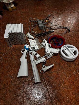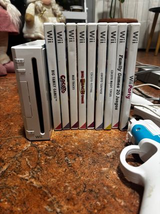 Consola Nintendo Wii en color blanco, lista para horas de diversión. Incluye varios juegos. - - Big Family Games - Cocoto Kart Racers - Mad Tracks - Big Beach Sports - Cocoto Festival - Cocoto Surprise - Cocoto Magic Circus - Family Games 20 Juegos - Wii Party Varios accesorios : - dos mandos - 4 volantes (dos blancos con luces) (rojo y azul básicos) - caña de pesca - escopeta - dos pistolas