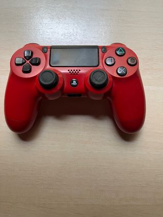 Mando de PlayStation 4 en color rojo. - Diseño ergonómico. - Botones de acción y direccionales. - Panel táctil. - Conexión inalámbrica. Tiene bastante uso pero ningún fallo a la hora de jugar. Los joysticks están desgastados y quité las gomas y le puse éstas gomas protectoras