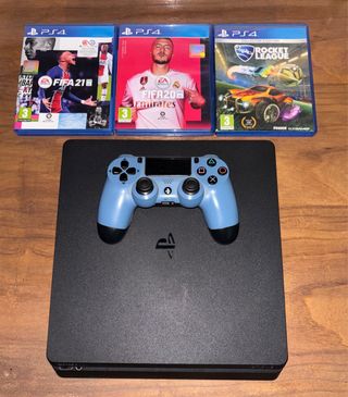 Consola PlayStation 4 Slim con 825GB de almacenamiento. - Incluye los juegos FIFA 21, FIFA 20 y Rocket League. - Mando de color azul claro. - Funciona como el primer dia