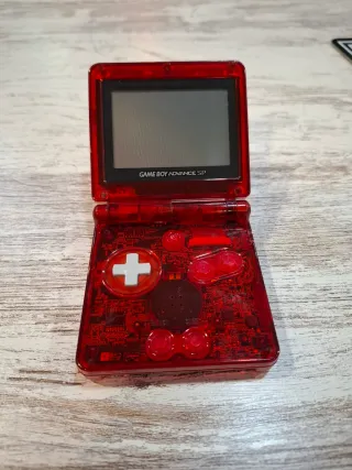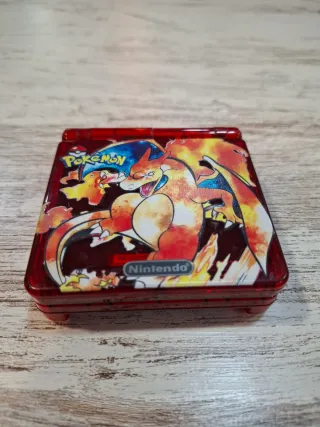 Consola portátil Game Boy Advance SP con un diseño especial de Pokémon. - Diseño de Charizard y el logo de Pokémon. - Cargador original - Carcasa de color rojo translúcido.