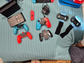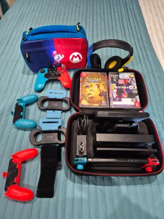 Consola Nintendo Switch con accesorios y 8 juegos, mandos y 2 maletines - Incluye funda temática de Mario. - Mando Pro Controller. - Auriculares. - Funda de transporte. - Juegos incluidos: Rayman Legends, FIFA 21, y otros 6 títulos. - Todo lo que se vé en las fotos.