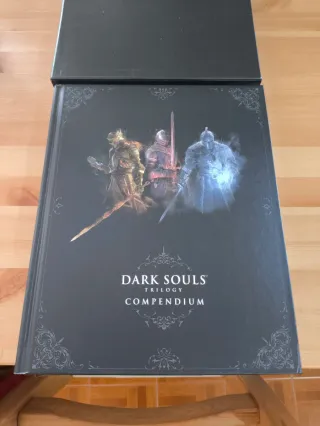 Este compendio de la trilogía Dark Souls es una edición especial. - Portada con diseño de armaduras y espadas. - Título Dark Souls Trilogy Compendium en relieve dorado.