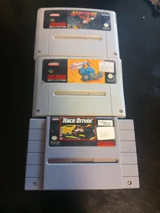 Tres cartuchos de juegos para Super Nintendo. - Aerobounce - Un juego de carreras - Race Drivin