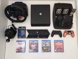 Vendo ps4 pro, volante Logitech g29 y la palanca de cambios en H y accesorios (fundas de silicona para los mandos, soporte para la ps4 y juegos). La ps4 pro está perfectamente. El volante Logitech g29 y la palanca de cambios en H están prácticamente nuevos los he usado 5 veces y no tienen ningún tipo de rasguño. El soporte de la ps4 tiene unos ventiladores en la parte inferior para ventilar la ps4. Los juegos también están perfectos.