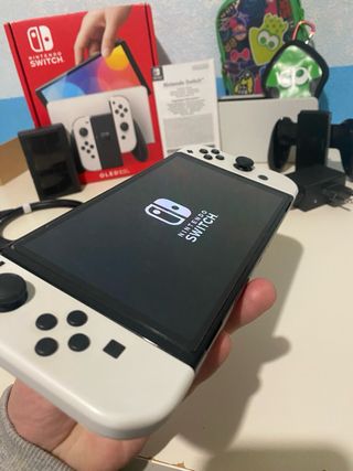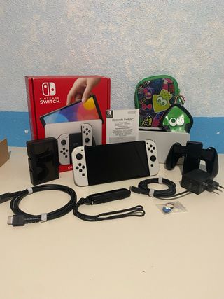 Consola Nintendo Switch OLED en color blanco, edición completa. Código XTJ700671599690 Incluye: - Pantalla Oled 7 Pulgadas - Joycons color blanco - Almohadillas para Joycons (Edición Pokèmon) - Soporte para Joycons - Cargador original - Correas - HDMI original - Estuche portajuegos (Capacidad para 12 juegos)