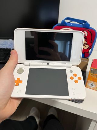 Consola portátil Nintendo New 2DS XL en llamativos colores blanco y naranja. Diseñada para una experiencia de juego cómoda y portátil. - Pantalla superior e inferior. - Botones de acción naranjas. - Diseño plegable. - Con funda de tela y funda semirrígida incluida
