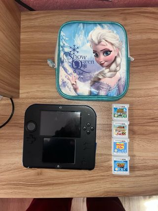 Consola Nintendo 2DS en color negro, ideal para disfrutar de una gran variedad de videojuegos. Incluye una funda temática de Frozen y cargador - Consola Nintendo 2DS negra. - Funda de transporte Frozen: El reino del hielo. - Juego Animal Crossing: New Leaf. - Juego Tomodachi Life. - Juego Yo-kai Watch. - Juego Mario & kart 7 (instalado en la nintendo) -Tomodachi life: version bienvenida (instalado en la nintendo) - juego Happy home designer la consola se encuentra en perfecto estado no tiene ninguna golpe ni daño y funciona todo correctamente.