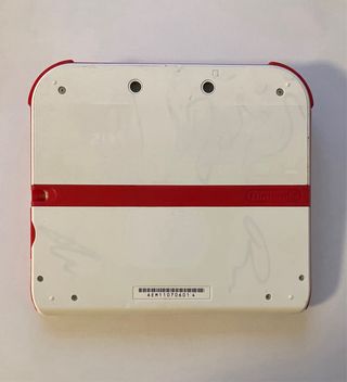 Consola portátil Nintendo 2DS en color blanco y rojo. - Pantalla superior e inferior. - Botones de control direccional y de acción. - Altavoz integrado.