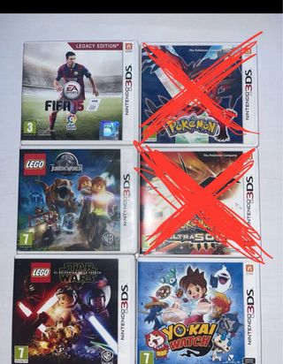 Vendo una colección de juegos para Nintendo 3DS en muy buen estado. - Incluye los juegos FIFA 15, LEGO Jurassic World, LEGO Star Wars: El despertar de la fuerza, Pokémon Y, Pokémon Ultrasol y Yo-kai Watch. - Todos los juegos están completos y en sus cajas originales.