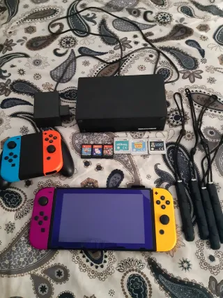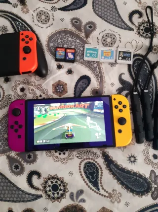 Consola Nintendo Switch con Joy-Cons en morado y amarillo. - Incluye base de carga. - Incluye dos pares de correas para Joy-Cons. - Incluye varios juegos para Nintendo 3DS.