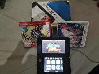 Consola Nintendo 3DS XL en color azul, junto con dos juegos de Pokémon. - Pokémon Rubí Omega - Pokémon Y