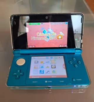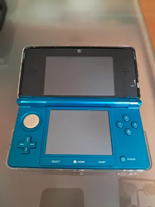 Consola portátil Nintendo 3DS en color azul agua. - Pantalla superior e inferior. - Botones de control direccional y de acción. - Botones Select, Home y Start. - Botón de encendido/apagado. Funda y protector. Cargador original.