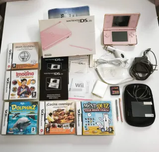 Consola portátil Nintendo DS Lite en color rosa, ideal para llevar tus juegos a todas partes. Incluye varios títulos y accesorios. - Consola Nintendo DS Lite - Juego: Mas Brain Training - Juego: Imagina ser Cocinera - Juego: DolphinZ - Juego: ¡Cocina conmigo! - Juego: Mind Quiz Your Brain Coach - Tarjeta DS con 26 juegos - Cargador de coche - Cargador de pared - Funda de transporte - Lápices táctiles - Protector de pantalla - 2 Fundas de transporte Tarjetas